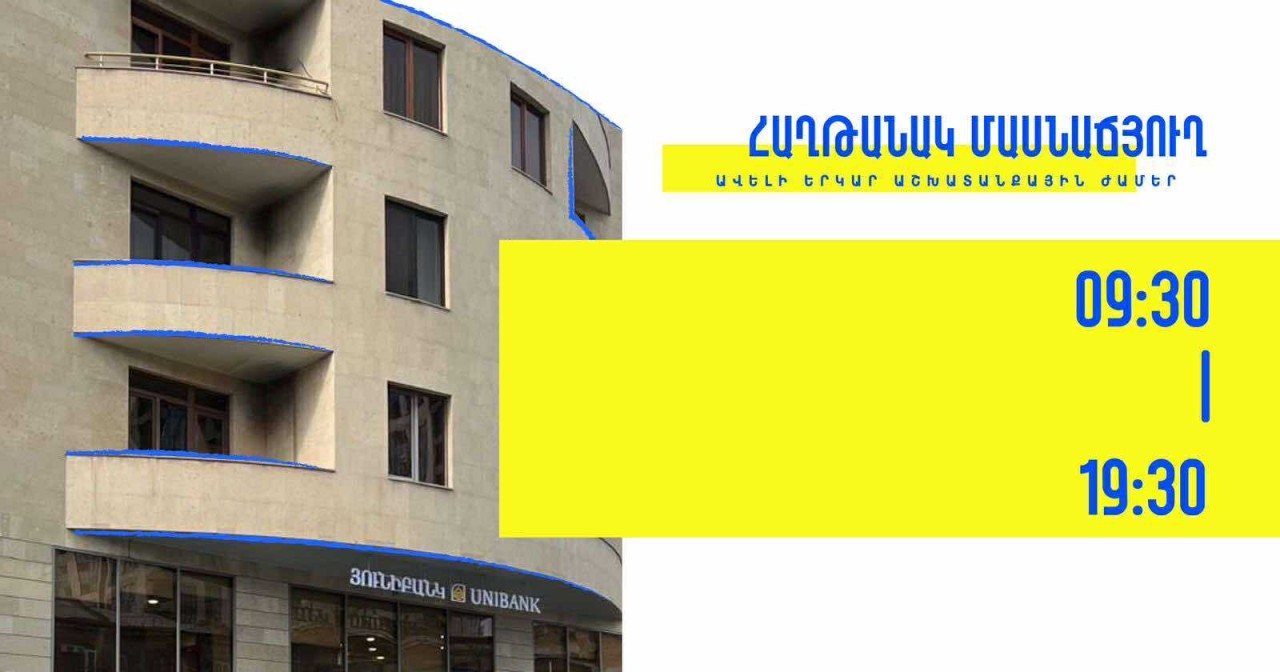 Յունիբանկի «Գարեգին Նժդեհ» մասնաճյուղն այսուհետ հաճախորդներին կսպասարկի նոր, առավել ընդարձակ և ժամանակակից չափանիշներով կառուցված գրասենյակում: Մասնաճյուղի նոր տարածքի հասցեն է ք.Երևան, Արշակունյաց պող., 34/3 շենք /«Երևան Մոլ» առևտրի և զվարճանքի համալիր/: Մասնաճյուղն աշխատելու է առանց հանգստյան օրերի և երկարացված ռեժիմով` հաճախորդներին սպասարկելով ժամը 10:00-ից մինչև 22:00-ն: Մանրածախ ուղղության զարգացման ռազմավարության շրջանակներում Յունիբանկը հետևողականորեն բարելավում է սպասարկման որակը և մասնաճյուղերի աշխատանքային ռեժիմը սահմանում հաճախորդների սպասումներին համապատասխան: Երկարացված աշխատանքային օրը և շաբաթ-կիրակի օրերին ևս սպասարկում իրականացնելը հնարավորություն են տալիս հաճախորդներին այցելել բանկ և օգտվել որակյալ բանկային ծառայություններից իրենց համար առավել հարմար ժամերին: