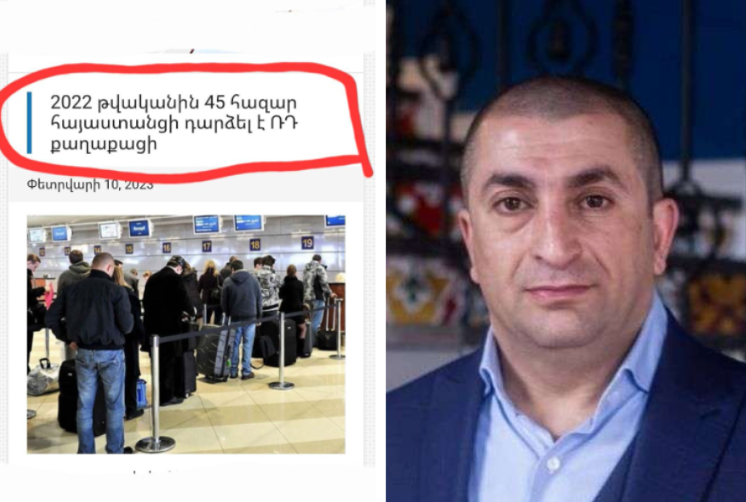 2019 թ-ի նոյեմբերի վերջին ռուսաստանյան ԶԼՄ-ներում հրապարակվեց Ռուսաստանի ՆԳՆ-ի եւ "Ռոսստատ"-ի տվյալները, ըստ որոնց, 2019 թ-ի հունվար-սեպտեմբերին ՀՀ քաղաքացիությունից հրաժարվել եւ ՌԴ անձնագիր է ստացել Հայաստանի 17 հազար քաղաքացի... Հիշեցնեմ, որ 2017 թ-ին ՌԴ քաղաքացիություն էր ստացել 25 հազար 144 ՀՀ քաղաքացի, իսկ 2018 թ-ին՝ 27 հազար 100-ը... Պարզ մաթեմատիկական հաշվարկ կատարելով` կարելի է հավելել, որ մինչեւ 2019 թ-ի վերջը ՌԴ քաղաքացիություն ստացողների թիվը կազմել է մոտ 23 հազար մարդ... Եթե այս թվին գումարենք վերջին երկու տարում "գրին քարտով" համապատասխանաբար 1669 եւ 2844 ՀՀ քաղաքացիությունից հրաժարվողներին, ինչպես նաեւ Հայաստանի քաղաքացիների կողմից այլ երկրների քաղաքացիություն ընդունելը, ապա կստացվի բավականին պատկառելի թիվ, որը աղետալի է մեր երկրի համար...