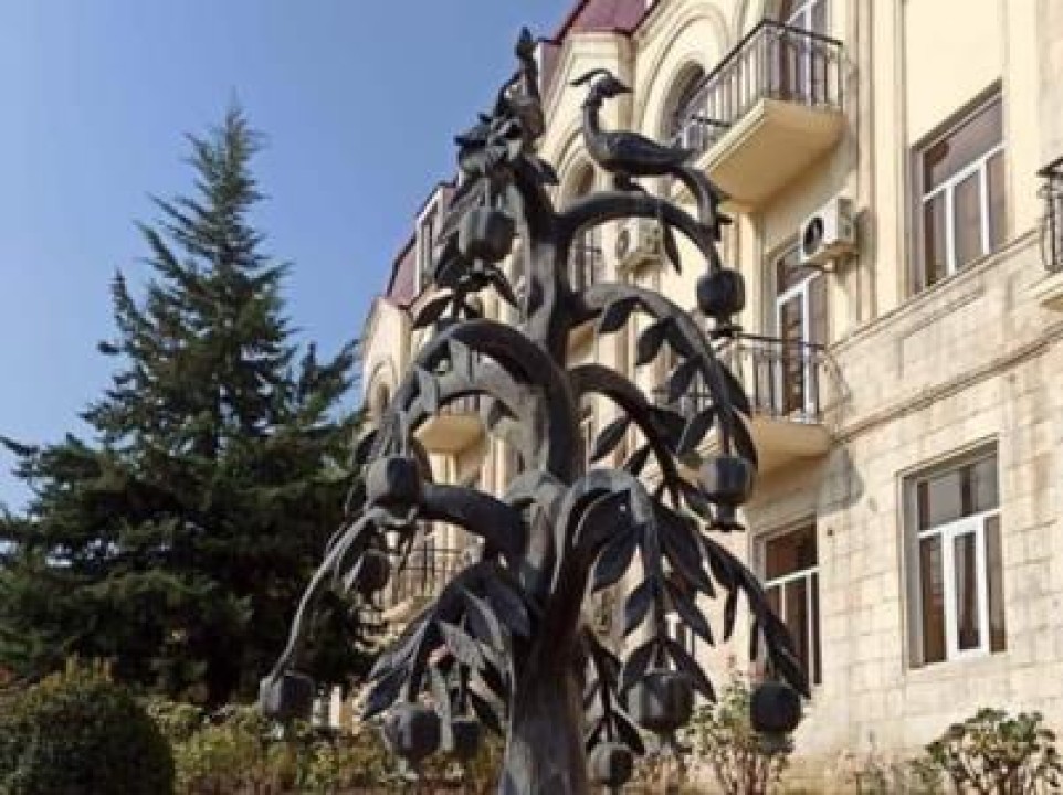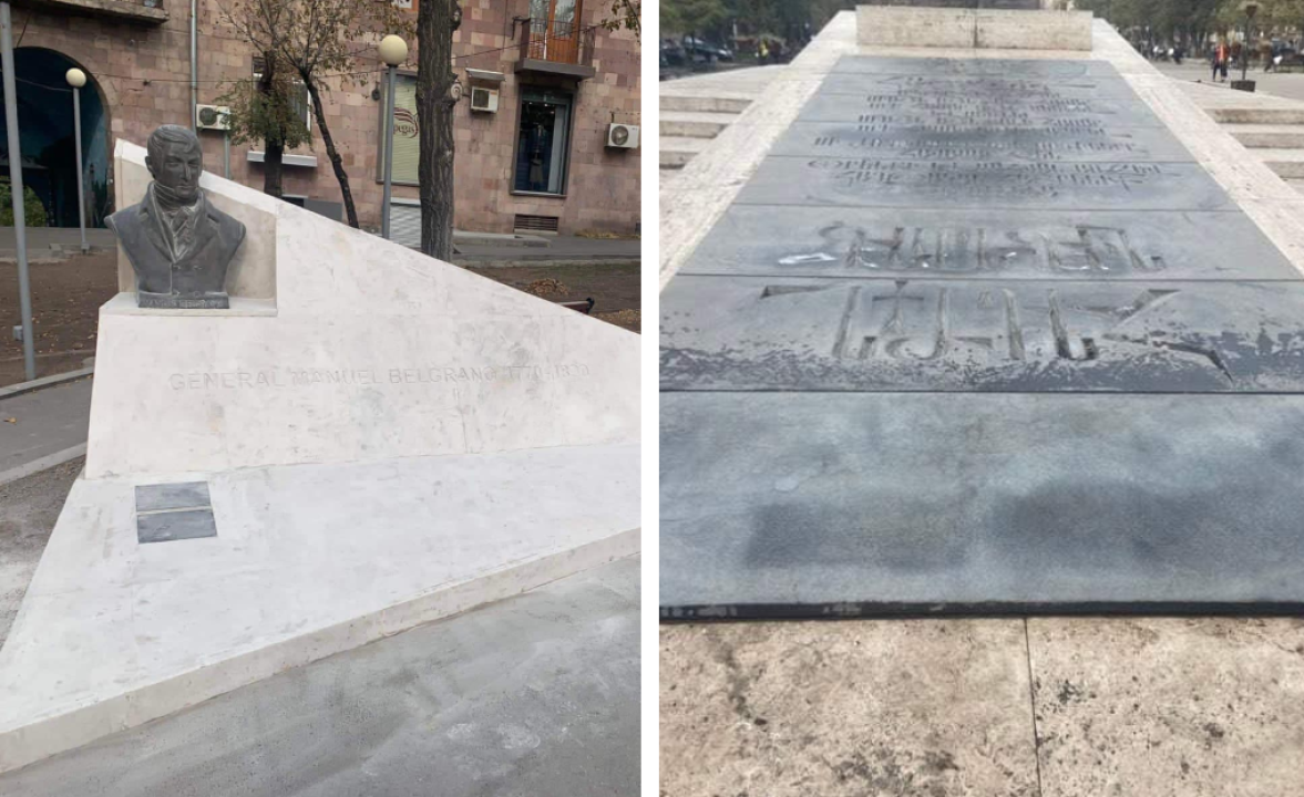Ադրբեջանական ԶԼՄ–ները տեղադրել են հուշարձանի հայկական տեսքով հին նկարները և դրան կցել ավելի վաղ՝ ԽՍՀՄ տարիներին արված նկարներ՝ ցույց տալով, որ իբր հայերը քաղաքը 1992 թ. մայիսի 9-ին ազատագրելուց հետո են հուշարձանի վրա հայկական հետքեր թողել։ Սակայն այդ հուշարձանի վրա արաբատառ գրություններ հայտնվել էին միայն քաղաքում 1910-ների վերջին տեղի ունեցած հայկական ջարդերից հետո։ Իսկ հուշարձանի սկզբնական տեսքը հենց հայկական է եղել։