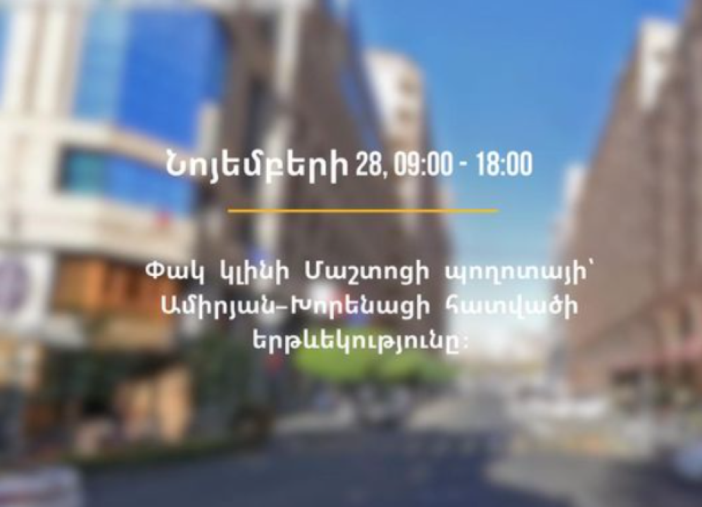մայրաքաղաքի ամանորյա տոնական ձևավորման աշխատանքներով պայմանավորված՝ նոյեմբերի 22-ին, ժամը 09:00-ից մինչև 16:00-ն փակ կլինի Մաշտոցի պողոտայի՝ Թումանյան փողոցից մինչև Սայաթ-Նովա փողոց հատվածի երթևեկությունը»,- նշված է քաղաքապետարանի հաղորդագրությունում: