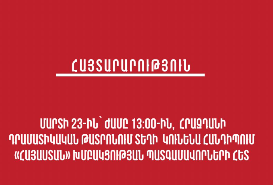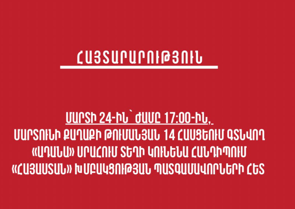 Ս/թ նոյեմբերի 25-ին` առաջիկա շաբաթ օրը՝ ժամը 11։00-ից 14։00-ը, կամ 15։00-ից 18։00-ը, ՀՅԴ Երևանի գրասենյակներում տեղի կունենան ՀՀ ԱԺ «Հայաստան» խմբակցության պատգամավորների հանդիպումներ քաղաքացիների հետ: