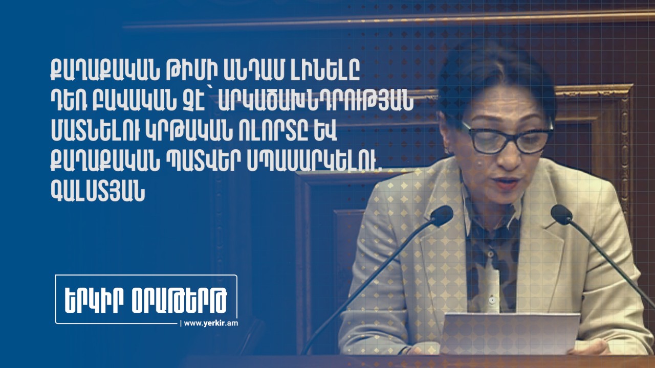 «Սրանք ո’չ մեղքի, ո’չ բարոյականության, ո’չ խղճի, ո’չ Հայրենիքի, ո՛չ պետականության, ո’չ սեփական պատմության, ո’չ ազգային իղձերի, ո’չ անցյալի ժառանգության, ո’չ ինքնության, ո'չ սրբազան նահատակների, ո’չ մեր հավաքական ապագայի հետ կապ ունեն», - գրում է ՀՅԴ Գերագույն մարմնի անդամ, ՀՀ ԱԺ «Հայաստան» խմբակցության պատգամավոր Լիլիթ Գալստյանը։