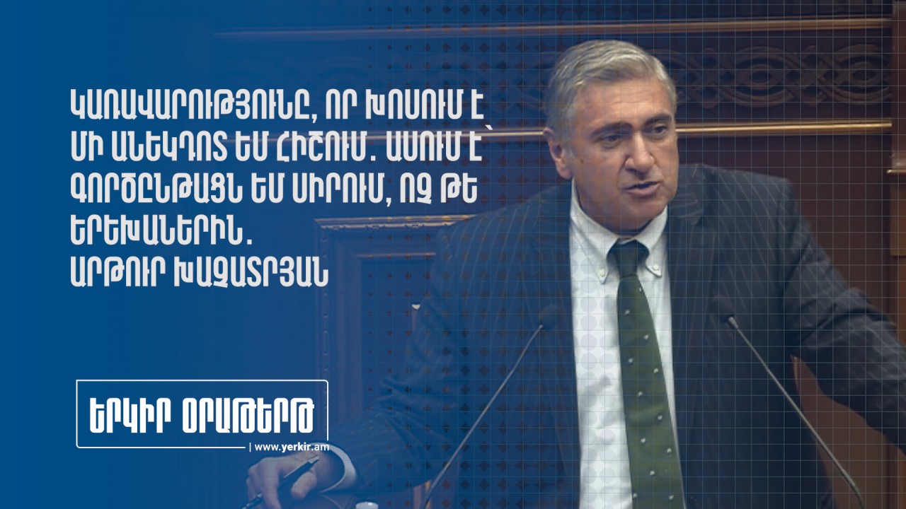 «Լեռնային Ղարաբաղ, թե Լեռնային Ղարաբաղի Հանրապետություն, իրավաբանները կգրեն, բայց իրավաբանները քաղաքական պատվեր են կատարում։ Վերջին փաստաթուղթը, որը ներկայացվել էր այս խորհրդարան, դա բյուջեի նախագիծն էր, հանձնաժողովում քննարկումից հետո հանրապետություն բառը դուրս եկավ։ Ամբողջ աշխարհում Լեռնային Ղարաբաղի Հանրապետության դեմ խոսում է Հայաստանի կառավարությունը եւ Ադրբեջանի կառավարությունը։ Օրինակ՝ Կանադայի արտաքին գործերի նախարարությունը կարծես դեկտեմբերի 12-ին հայտարարություն էր տարածել, որ Արցախյան հակամարտությունը պետք է կարգավորվի ԵԱՀԿ Հելսինկիի եզրափակիչ ակտի երեք սկզբունքների հիման վրա»,-Ազգային ժողովի արտահերթ նստաշրջանում 2023 թվականի պետական բյուջեի մասին օրենքում լրացում կատարելու մասին նախագծի քննարկման ժամանակ ասաց «Հայաստան» խմբակցության պատգամավոր Արթուր Խաչատրյանը։