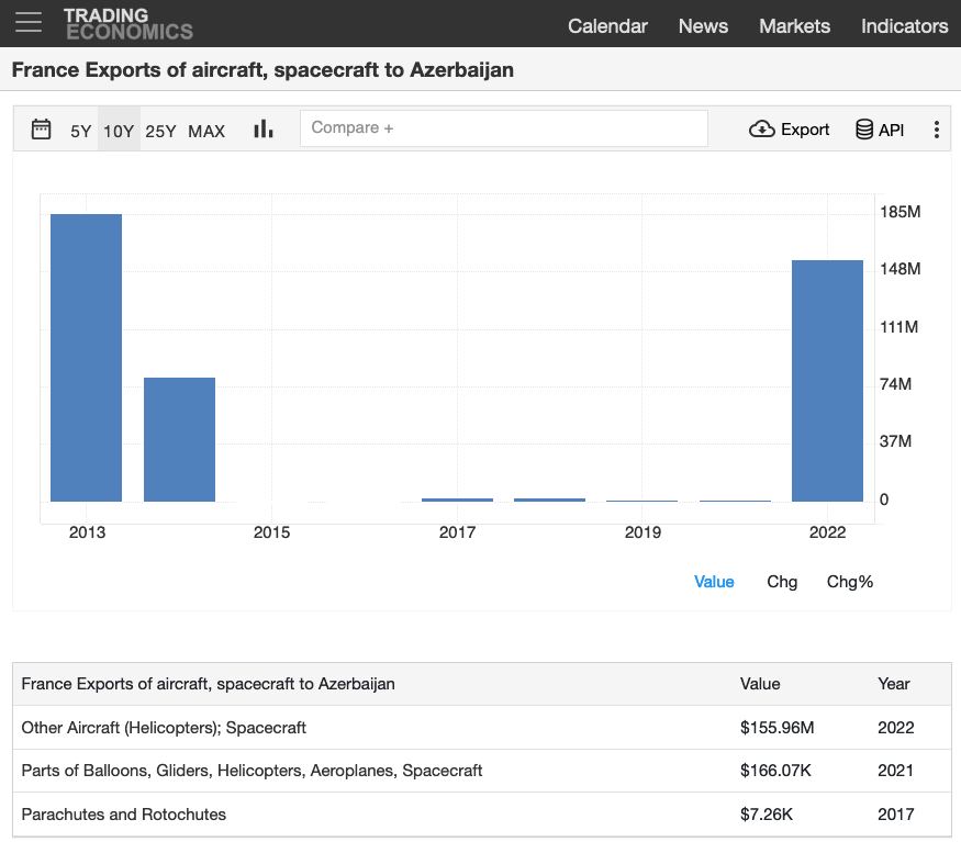 Սա է պատճառը, որ Ֆրանսիան Ադրբեջանին է վաճառում երկակի նշանակության ապրանքներ, որոնք Ադրբեջանն օգտագործում է ռազմական նշանակությամբ։ Օրինակ՝ 2022թ. միայն պաշտոնական տվյալներով Ֆրանսիան Ադրբեջանին է վաճառել ավելի քան 155 միլիոն դոլարի մթերք, որոնք օգտագործվել են ռազմական ուղղաթիռների համար։