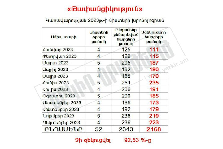 Կառավարության 2023 թ. նիստերում քննարկված 2343 հարցից 2168-ը կամ 92,53%-ը եղել է չզեկուցվող։