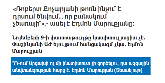 Հիմա, երբ միայն շատ ալարկոտը չի խոսում Նիկոլ Փաշինյանի կործանարար քաղաքականության և վերջինիս փոփոխության անհրաժեշտության մասին, Էդմոն Մարուքյանի այս քայլն ավելի շատ հատուկ հանձնարարականներով հրաժարական է հիշեցնում քաղաքական դաշտի հնարավոր վերադասավորումներից առաջ, որոնց դեռ պետք է պատրաստվել և փորձ անել հանրությանը ներկայանալ ազգային-պետական շահերը սպասարկողի դիրքերից, ոչ թե որպես կործանվող քաղաքական թիմի շարքային անդամ։