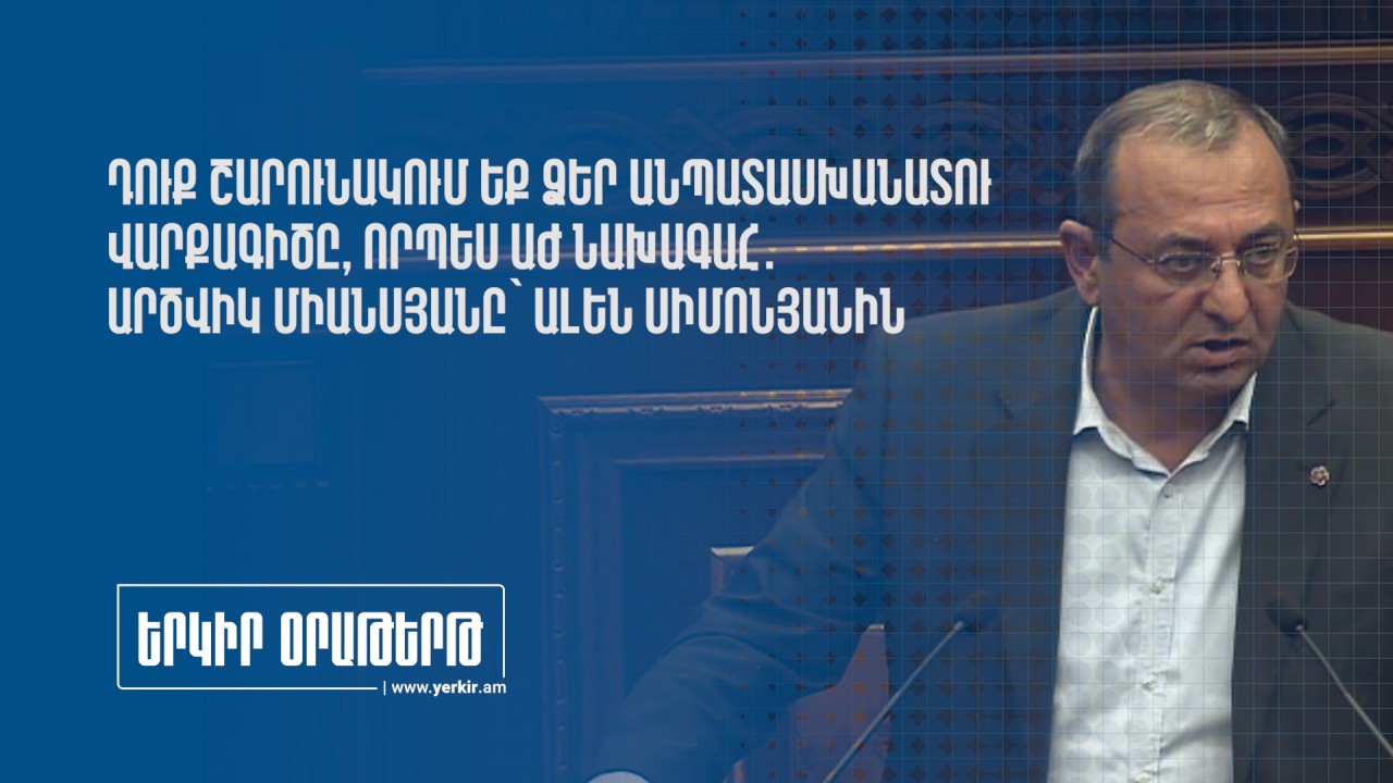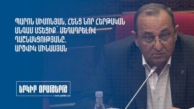 «Երեկ Երեկոյան դուք թույլ տվեցիք անթույլատրելի մի արարք, և որպես ԱԺ նախագահ սա առաջի դեպքը չէ»։ Ասաց «Հայաստան» խմբակցության քարտուղար Արծվիկ Մինասյանը՝ Ալեն Սիմոնյանը։