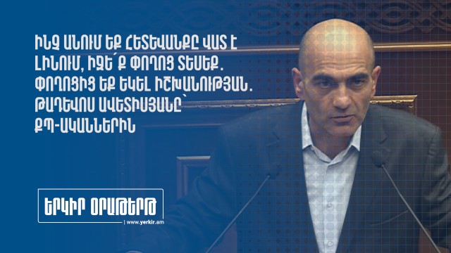 «Որ մի բան լավ եք անում, անպայման հետը մի վատ բան պետք է անեք»,- այս մասին ՀՀ ԱԺ ութերորդ գումարման իններորդ նստաշրջանի հերթական նիստի ժամանակ ասել է «Հայաստան» խմբակցության պատգամավոր Թադևոս Ավետիսյանը՝ Թունյանին։