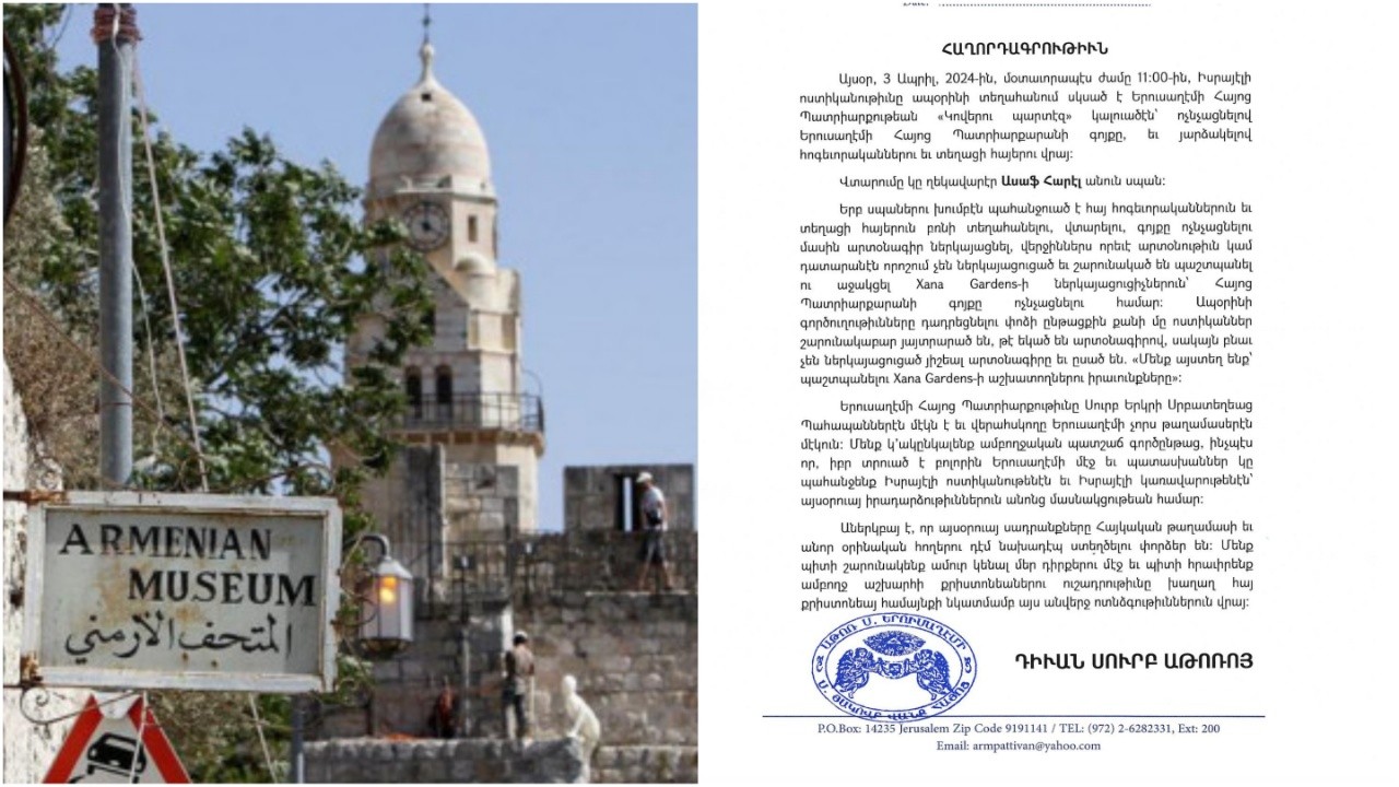 Հայտարարությունում ասվում է. «Երուսաղեմի հայ համայնքը և պատրիարքարանը կանգնած են լուրջ վտանգի առջև. ըստ հաղորդագրությունների, առանց համայնքի համաձայնության՝ ընթացքի մեջ է երկրորդ համաձայնագրի կնքումը Հայոց պատրիարքարանի և «Քսանա Գարդենս» ՍՊԸ-ի միջև։