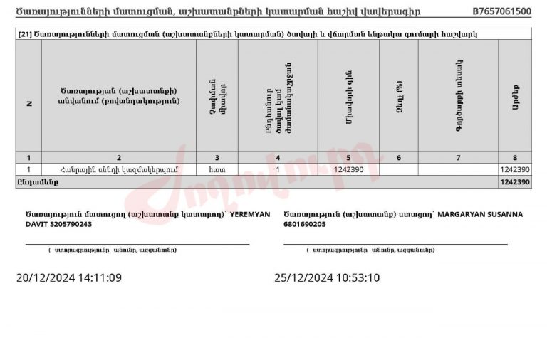 Մեկ այլ փաստաթղթի ուսումնասիրությամբ նկատելի է, որ 2024 թվականի համար «Հայր եւ որդի Երեմյաններ» ՍՊԸ-ի հետ Ազգային ժողովը կնքել է 5 մլն դրամ արժողությամբ պայմանագիր։