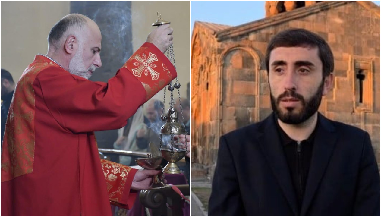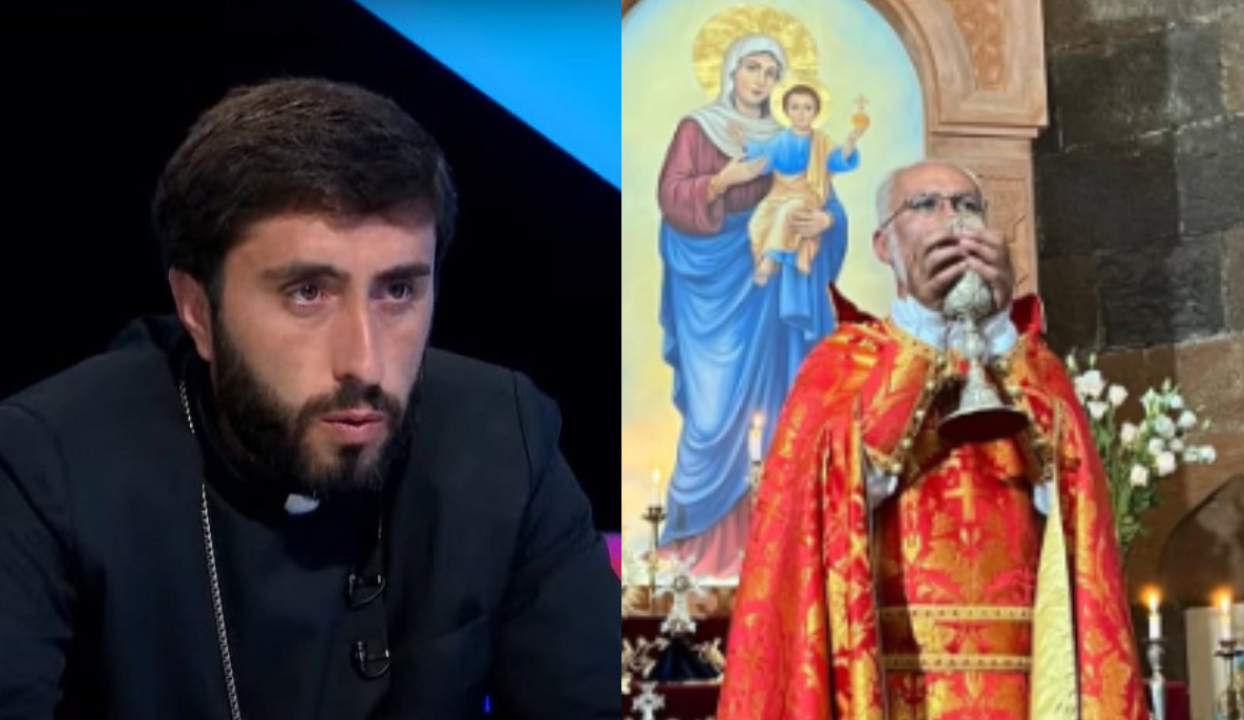 «Այս նկարում ձախից Վարդան Հունանյանն է (կարգալույծ նախկին քահանա տ.Տարոն), ով Թալինի Ս.Աստվածածին եկեղեցու խորանից Ս.Հաղորդություն է տալիս: Քանի որ մեր Առաքելական Սուրբ Եկեղեցու կողմից նա կարգալույծ է հռչակված, դա անելու որևէ արտոնություն չունի: Ավելին, նա նույնիսկ խորան բարձրանալու իրավունք չունի, անգամ դատարկ սկիհին ձեռք տալու իրավունք էլ չունի: Իսկ այս դեպքում սկիհի մեջ Տեր Հիսուս Քրիստոսի մարմինն ու արյունն է: Ճիշտ է, Աստված չի պղծվում, բայց նրա արածը սրբապղծություն է: Նա այսօր լուրջ դեմքով, սքեմը հագած, քահանայական խաչը կրծքին, որի իրավունքից էլ է զրկված, քայլում էր դեպի այսպես կոչված «աղոթքի նախաճաշ» միջոցառմանը (հղումը տես` մեկնաբանությունում):